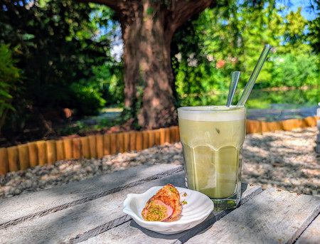 Neben dem Kalenberger Graben befindet sich der begehbare Langelinienwall. Wer bis zum Ende geht, wird das Frauengefängnis sehen und einen kurzen Blick auf die St. Godehard Kirche werfen können. Die Brücke am Frauengefängnis überquere ich noch und komme dann zu einem meiner liebsten Teile des Tages: das Café Senas Choice. Hier lege ich eine Pause ein und genieße passend zum Thema „Lieblingsgrün erleben“ einen leckeren Iced Matcha Latte. Am Ufer des Gewässers ist es so ruhig und entspannt. Ich schaue den Enten zu und genieße das schöne Wetter. Hier hätte ich noch lange sitzen können, aber ich folge dem Mühlengraben zum nächstes grünen Ort der Stadt.