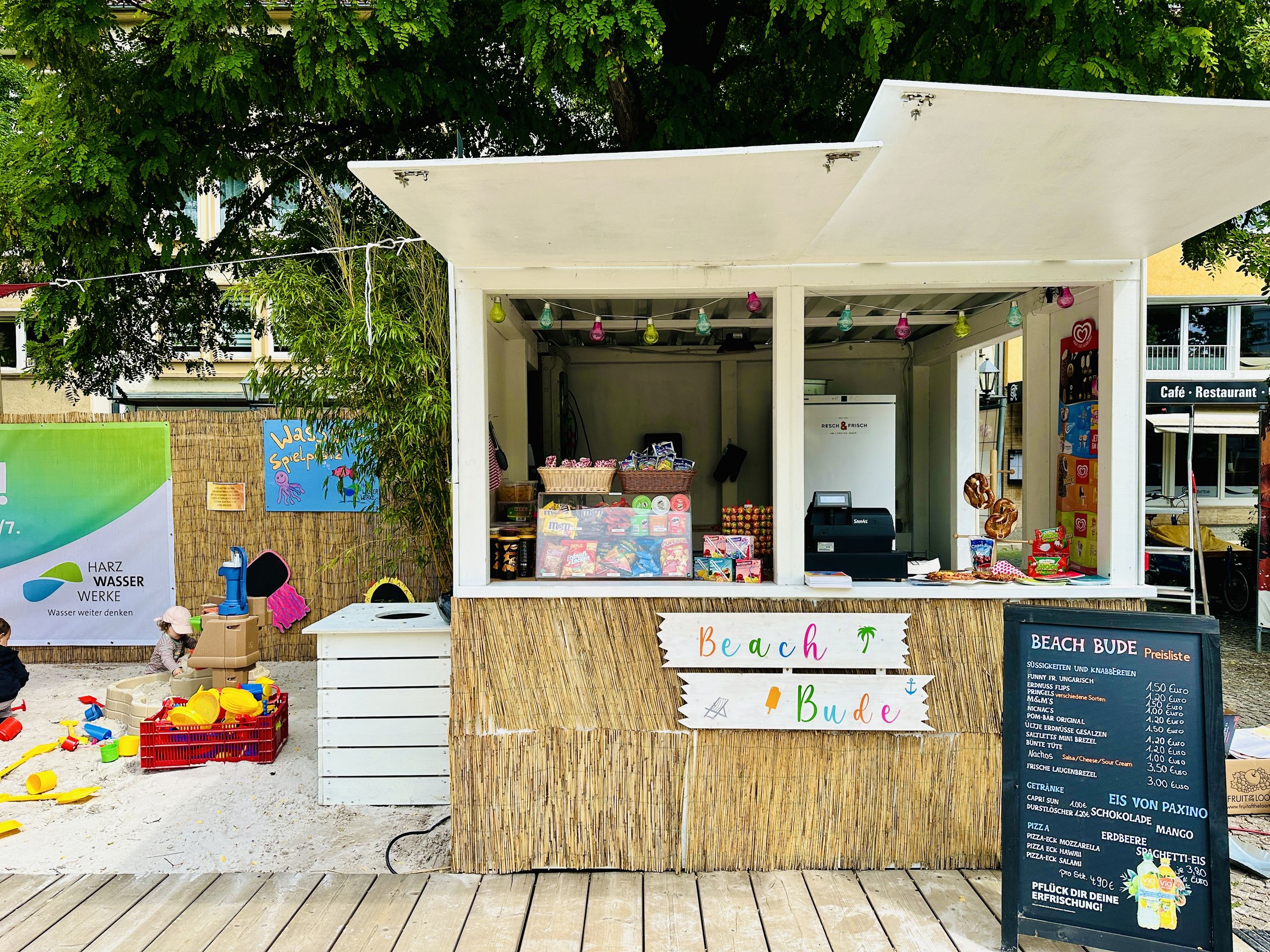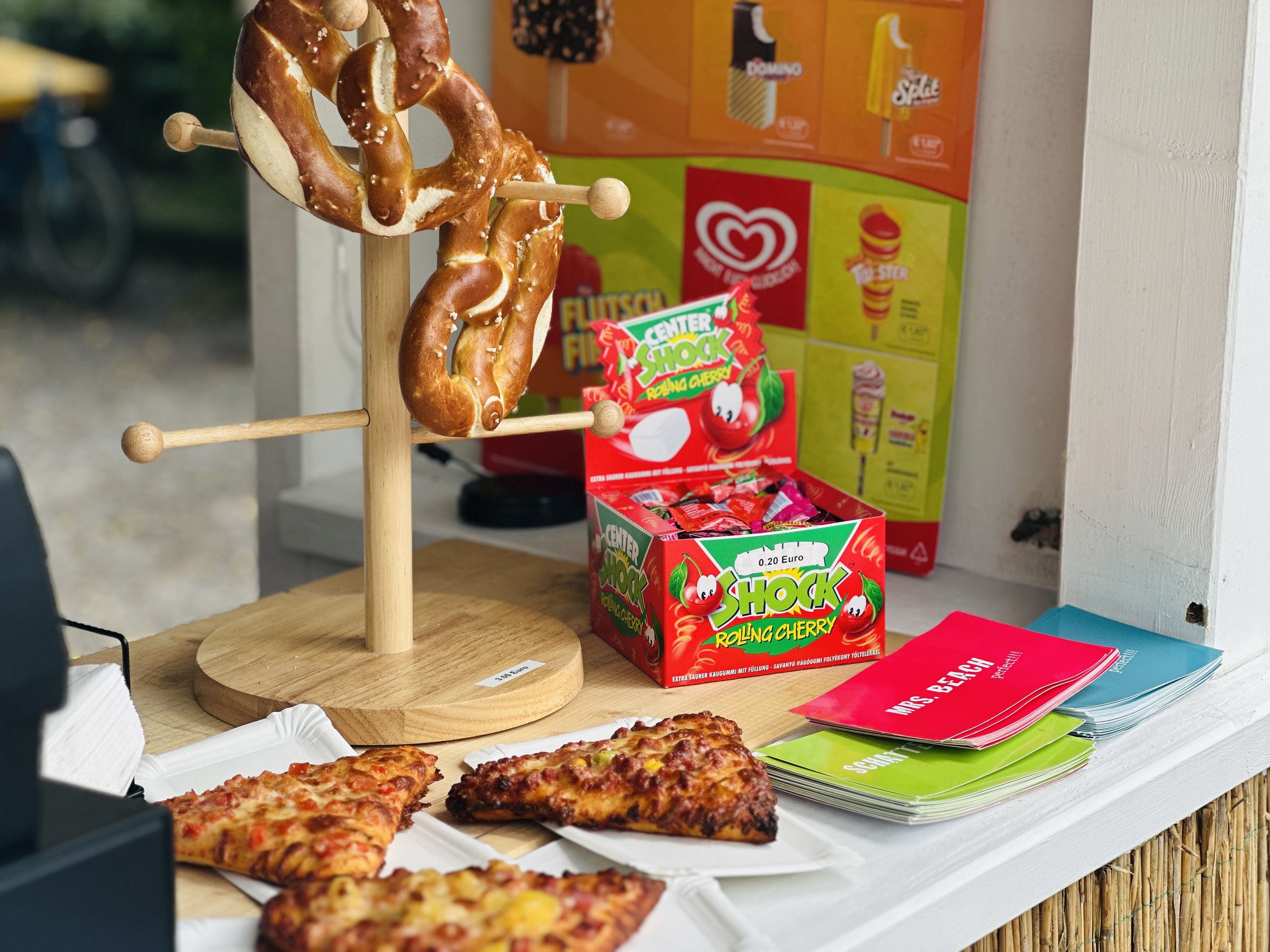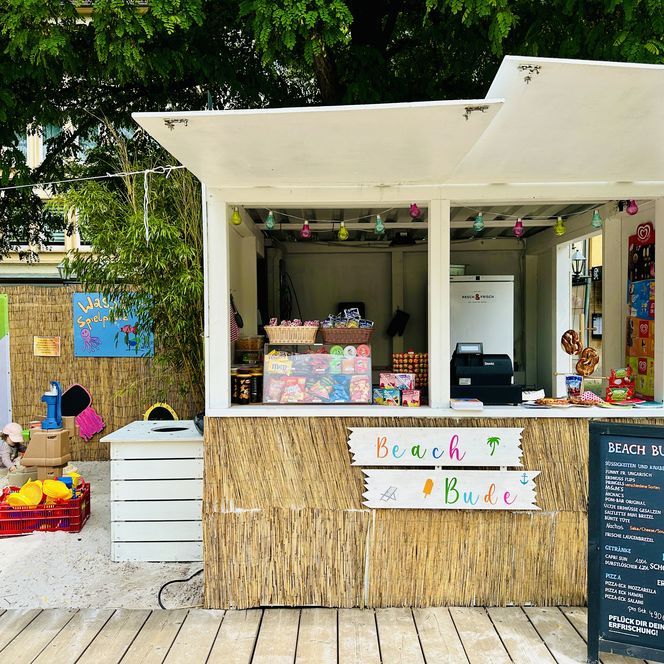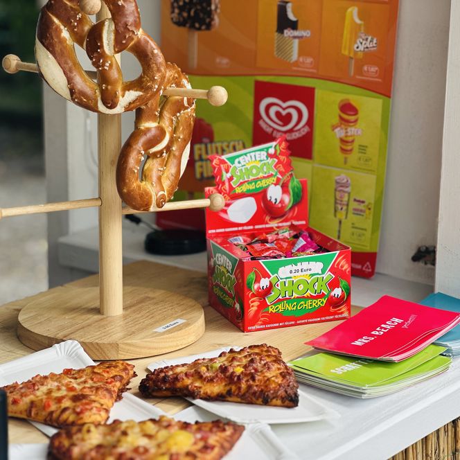 Der Kiosk Beach Bude versorgt alle Naschkatzen mit einer Reihe an Snacks: Es gibt bunte Tüten und viele andere Süßigkeiten, Popcorn, Chips und andere Knabbereien. Es werden auch frisch aufgebackene Brezeln, Käsebrezeln und Pizza-Ecken in den Sorten Mozzarella und Salami angeboten. Für Eisgenuss sorgen Langnese Eis am Stiel und leckere Eisbecher von Paxino. Die Eisbecher werden mit einem Holzspachtel in den Sorten Spaghetti-Eis, Erdbeere, Mango und Schokolade angeboten.