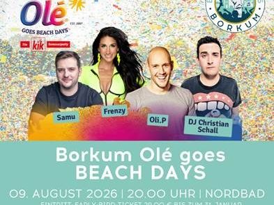 Im Rahmen der BEACH DAYS BORKUM 2026 verwandelt sich der Strand am Nordbad am Sonntag, den 09. August 2026, in eine riesige Open-Air-Partyzone. Mit Borkum Olé gastiert eines der erfolgreichsten Partyformate Deutschlands mitten auf der Insel und bringt echtes Mallorca-Feeling an die Nordsee.