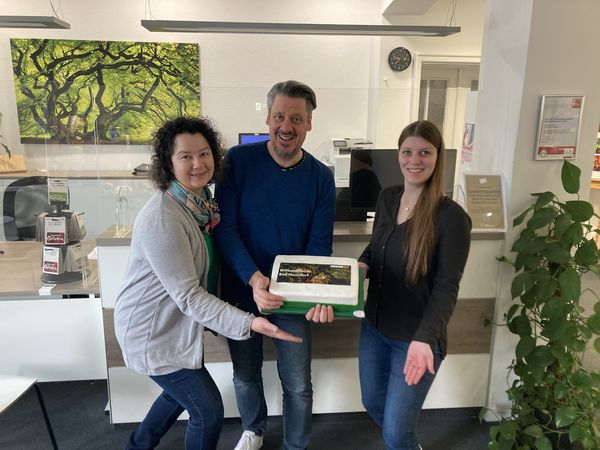 Foto: KurT Bad Nenndorf: Für die Umsetzung des Relaunches sowie die Weiterbetreuung zeichnen die Mitarbeiter:innen der Tourist-Information sowie des Citymanagements Bad Nenndorf verantwortlich. Zur Feier steuerte die betreuende Internetagentur Neusta aus Bremen eine Schokoladentorte mit der abgebildeten Startseite von badnenndorf.de in Fondant-Glasur bei, die Mirja Engert (li., Leitung Tourist-Information Bad Nenndorf), Marcus Feuerstein (mi., Citymanager) und Annabell Wögerbauer (re., Mitarbeiterin Tourist-Information Bad Nenndorf) präsentieren (Foto: KurT Bad Nenndorf).