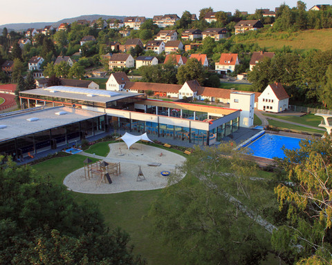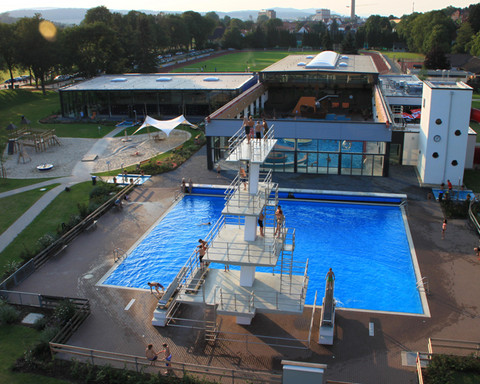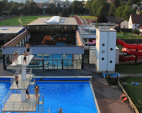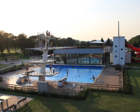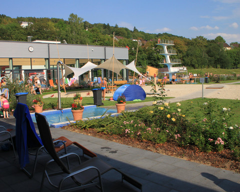 Zusätzlich gibt es natürlich noch ein waschechtes Freibad mit 21 m Becken, Sprungturm, Spielplatz, Beachvolleyball-Anlage und großer Liegewiese. Und natürlich einem Bistro, um sich nach all dem Toben zu stärken.