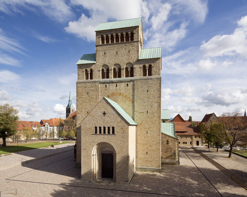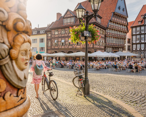 Wenn Sie bei Dunkelheit durch die romantischen Gassen des Michaelisviertels flanieren, schimmert Ihnen warmes Licht von unten aus dem Kopfsteinpflaster entgegen. Es stammt von zahllosen Leuchten, die sorgsam in Granitplatten verbaut und in die Straßen eingelassen sind. Rund 3000 dieser Platten bilden zusammen mit hoch aufragenden Stelen Hildesheims Welterbeband, das die beiden UNESCO-Welterbekirchen St. Michaelis und Mariendom mit weiteren Sehenswürdigkeiten der City verbindet. Der 1,2 Kilometer lange Weg beginnt am historischen Marktplatz, von dort spazieren Sie entlang des Kurzen Hagen auf den Michaelishügel und weiter zur St. Michaeliskirche. Wenn Sie die Aura des über tausend Jahre alten Sakralbaus genossen haben, geleiten Sie die Granitplatten (mit eingehauenen Schriftzügen wie „Welterbeband“) die Burgstraße hinab direkt zum nächsten Highlight, dem Dom, der allein durch seine Größe beeindruckt. Von dort gehen Sie dann über den Domhof zurück zum Marktplatz. Die Lichter weisen Ihnen so auf stilvolle Art und Weise den Weg durch Hildesheims „gute Stube“, und auch tagsüber ist das Welterbeband ein wertvoller Begleiter – zumal unterwegs allerlei Tafeln stehen, mit Stadtplänen und Infos zu den Attraktionen am Wegesrand.